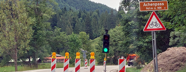 Auch wenn es das Wetter anfangs nicht besonders gut gemeint hat, die erste Bauphase der Sanierung der B 307 zwischen Landesgrenze (Achenpass) und Trifthütte konnte wie geplant abgeschlossen werden. Auf einer Länge von insgesamt 6,6 Kilometer wurden in dieser Bauphase die kompletten Bankette geschält, die Entwässerungseinrichten erneuert sowie nötige Pflasterarbeiten durchgeführt.