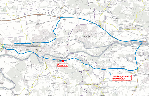Bis es soweit ist, muss die Staatsstraße in diesem Bereich gesperrt werden. Die Umleitung erfolgt großräumig, über die B 299 bei Altötting, dann nordwärts zur A 94 (AS Altötting) und über die Anschlussstelle Mühldorf Nord und die St 2092 (Bürgermeister-Hess-Straße) über die St 2352 (Nordtangente) zurück auf die St 2550 nach Polling. In der Gegenrichtung verläuft die Umleitungsstrecke entsprechend. Der Ehringer Hof (Ecke Innstraße/Traunstraße) bleibt während der gesamten Bauzeit erreichbar. Die Innstraße bleibt unter halbseitiger Verkehrsführung mit Ampelregelung geöffnet.