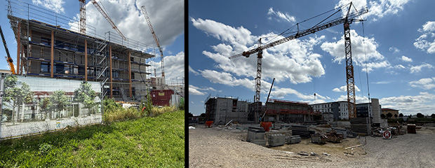 Seit dem Spatenstich im März dieses Jahres laufen die Arbeiten am neuen Amt für Ländliche Entwicklung in Mühldorf am Inn auf Hochtouren. Sämtliche Erdarbeiten sind bereits abgeschlossen und auch die beiden Treppenhäuser aus Stahlbeton sind bereits errichtet. Von einem mobilen Notdach vor Regen geschützt, werden aktuell die Fassadenelemente aufgestellt. Auch die ersten Fenster des dreigeschossigen Holzbau-Hybridbaus werden bereits eingebaut. Der bereits fertiggestellte Teil der Fassade, Ecke Mariä-Himmelfahrt-Straße/Harthauser Straße, vermittelt schon jetzt einen guten Eindruck davon, wie das Gebäude später einmal aussehen wird.