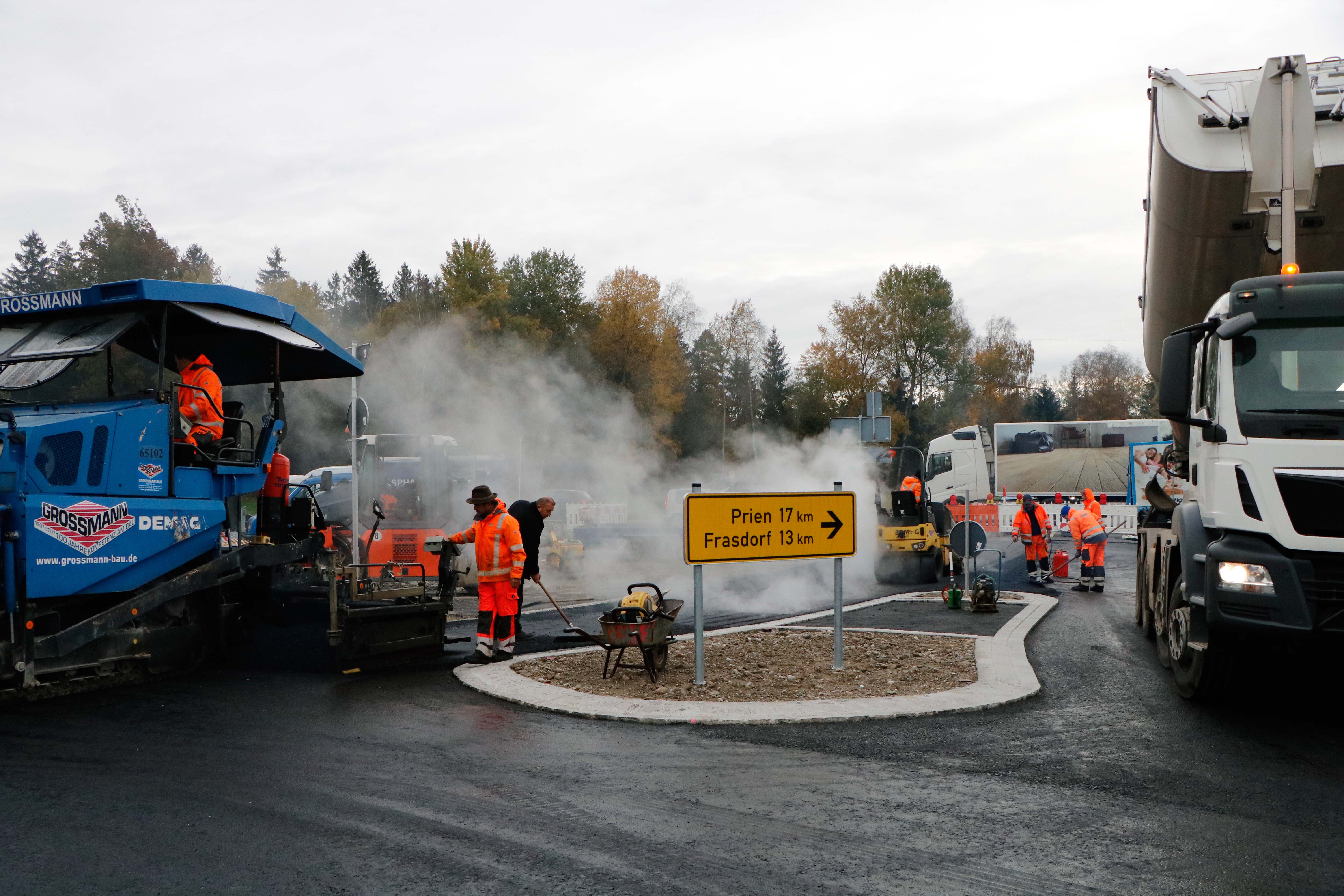 Der Leiter des Bereiches Straßenbau am Staatlichen Bauamt Rosenheim, Stefan Leitner, hob dabei vor allem den guten Ablauf der Baumaßnahme hervor. „Die Arbeiten haben Mitte Juli begonnen und konnten reibungslos durchgeführt werden. Das lag vor allem auch daran, dass die Arbeiten, durch die gebaute Umfahrung, abseits des laufenden Verkehrs durchgeführt werden konnten.“ Im Namen des Staatliche Bauamt Rosenheim freue er sich daher, den neuen Kreisverkehr termingerecht für den Verkehr freigeben zu können.