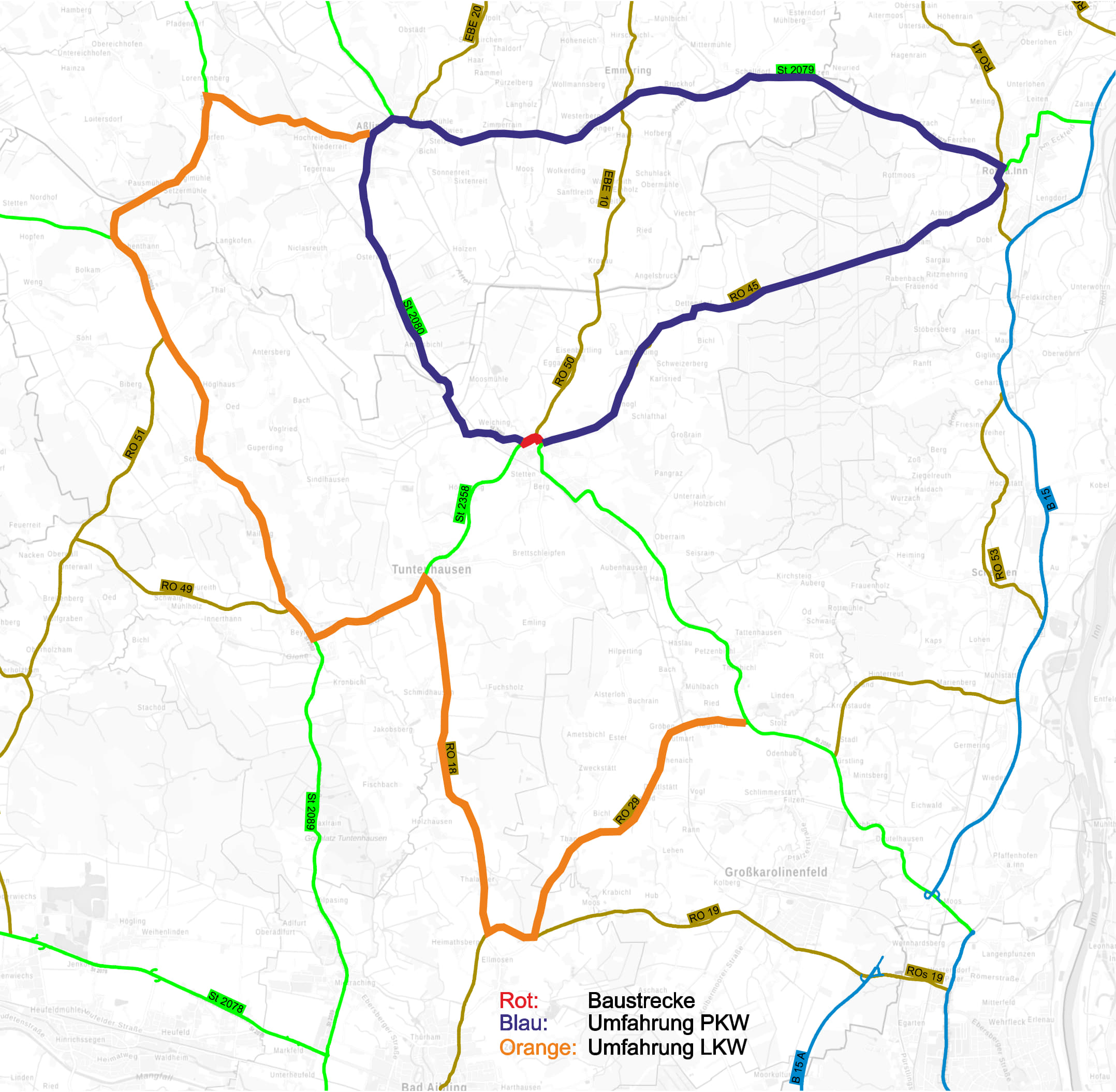 Die Umleitung erfolgt während der Zeit der Vollsperrung für Autos ab der Ortsmitte Ostermünchen auf der RO 45 Richtung Rott, weiter auf der St 2079 nach Aßling und von dort zurück auf die St 2080. LKW werden großräumiger nördlich von Deutelhausen (Weiler Stolz) über die RO 29 in Richtung Ellmosen und von dort weiter über die RO 18, über Tuntenhausen, Beyharting und Hohenthann nach Aßling beziehungsweise weiter über Rott am Inn nach Ostermünchen umgeleitet. In der Gegenrichtung erfolgen die Umleitungen entsprechend. Die Umleitungsstrecken sind in beiden Richtungen beschildert.