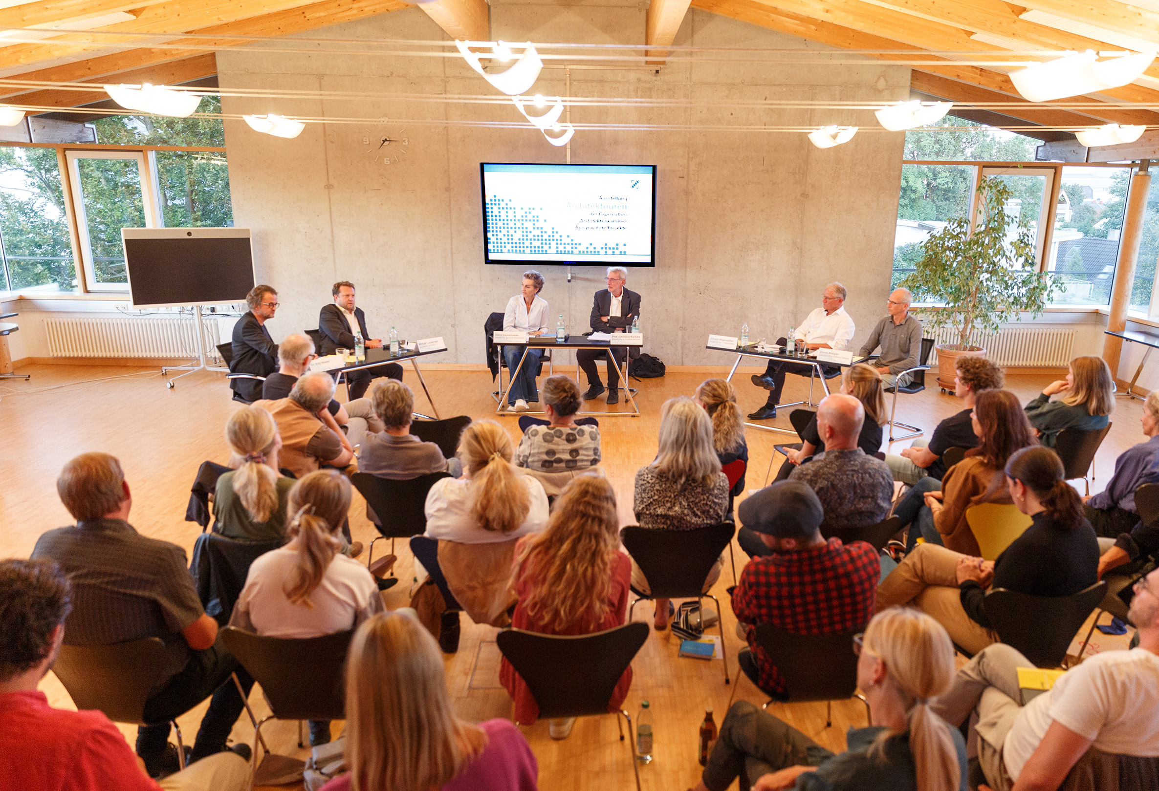 Auf dem Pressfoto 3 sieht man die Podiumsdiskussion, die im Rahemen der Eröffnung der Ausstellung „Architektouren 2023“ stattfand und das Thema Architektur und Nachhaltigkeit aufgriff. (Copyright „Staatliches Bauamt Rosenheim / Peter Lion“)