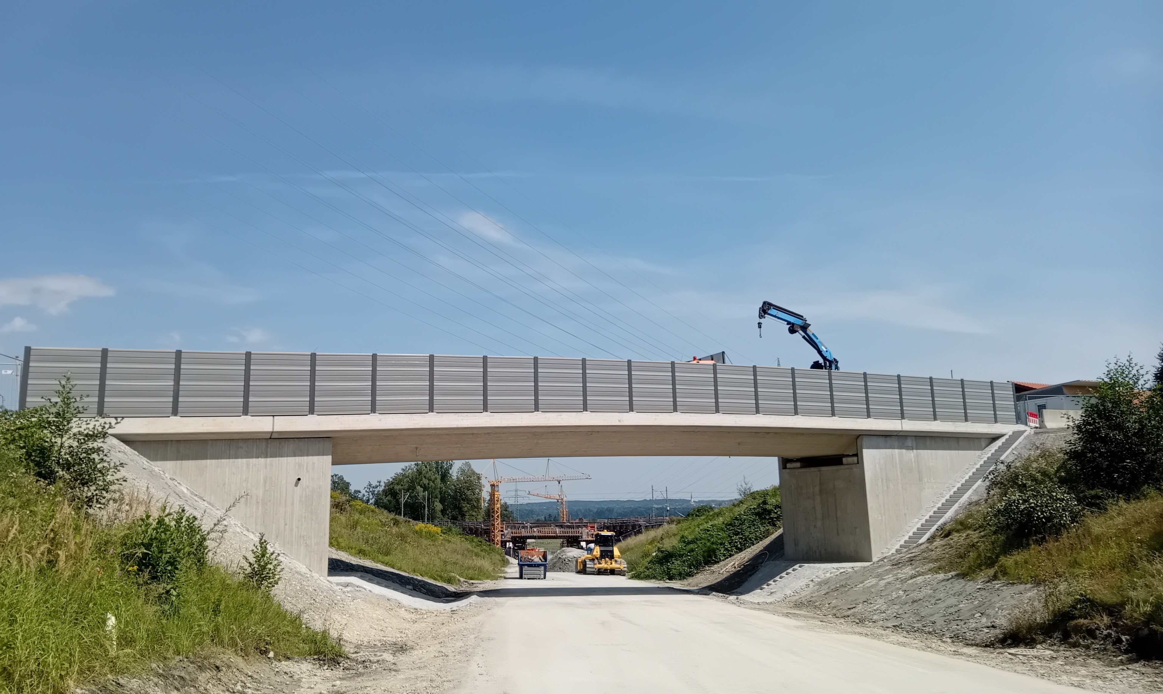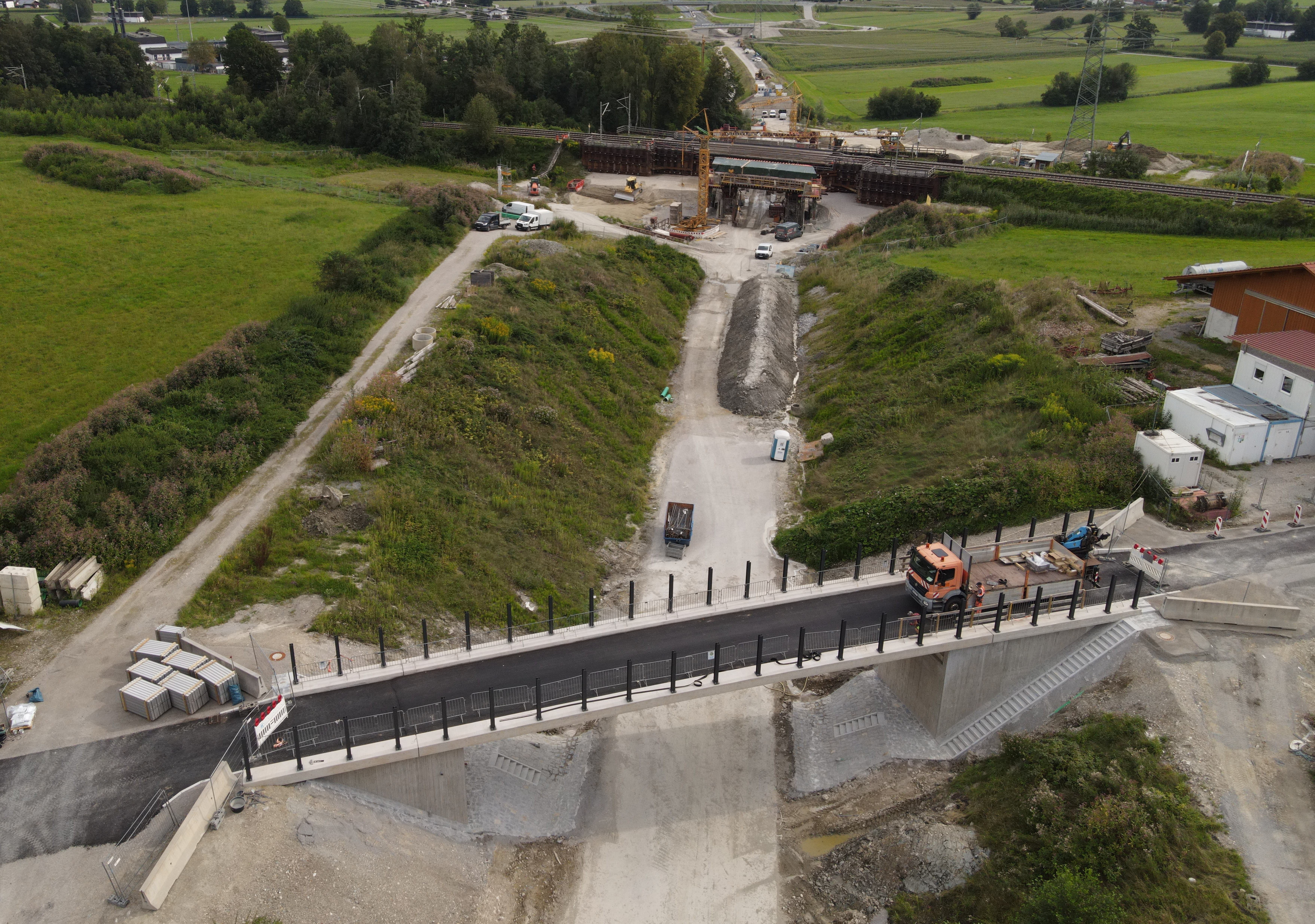 Eine davon ist die technisch hochkomplexe Bahnbrücke bei Wernhardsberg, unter der die Westtangente später hindurch führen wird. Hergestellt wird diese Brücke neben dem Bestand, in zwei Teilen, nördlich und südlich der Bahnlinie Rosenheim-München, eine der höchst frequentierten Eisenbahnlinien im transeuropäischen Eisenbahnnetz.