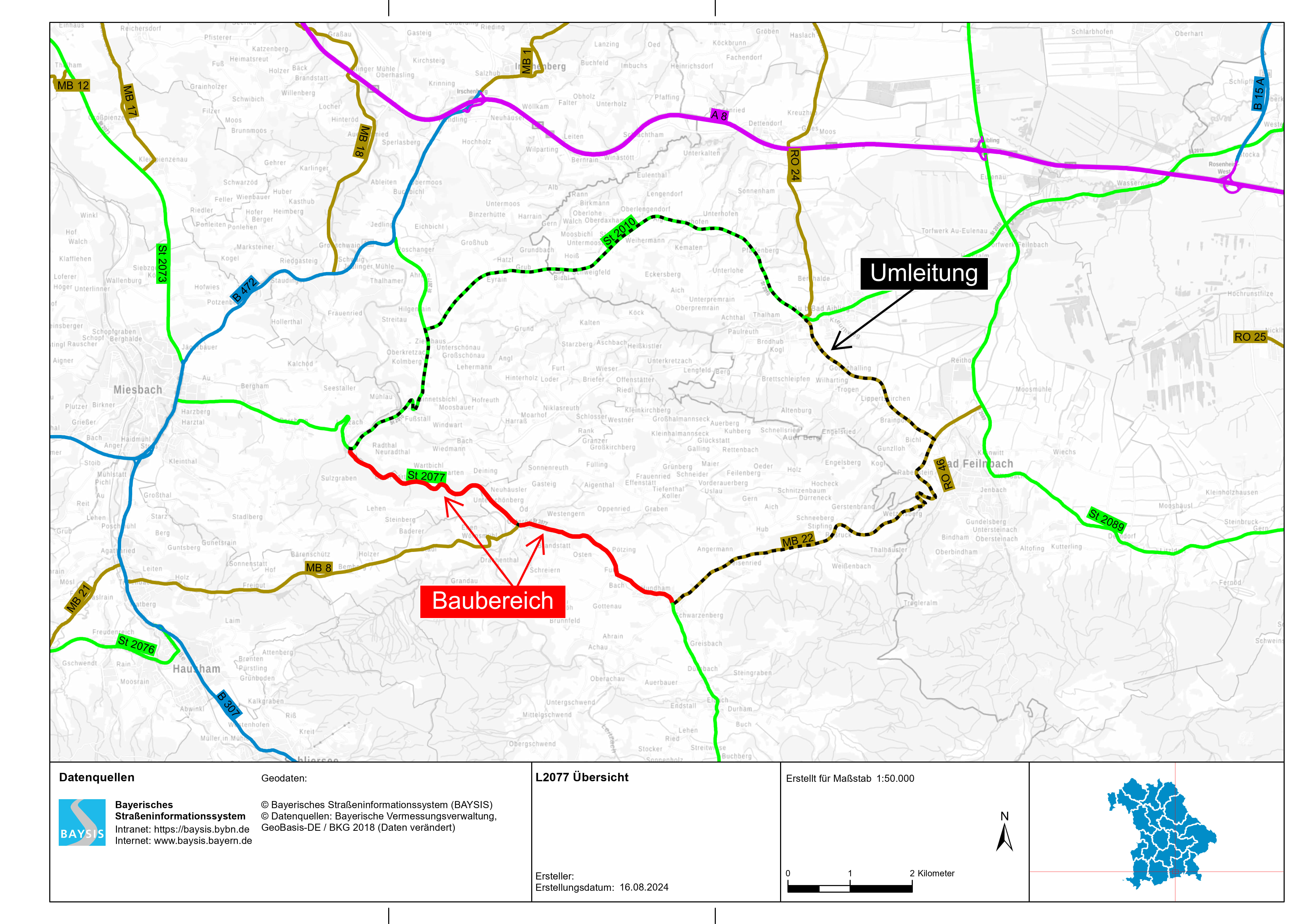 Für die Vorarbeiten ist die St 2077 von Montag, 9. September, bis einschließlich Freitag, 20. September, abschnittsweise halbseitig gesperrt. Anschließend folgt wegen umfangreicher Baggerarbeiten eine Vollsperrung der Staatsstraße von Montag, 23. September, bis einschließlich Donnerstag, 31. Oktober. Zunächst betrifft dies den Bereich zwischen Hundham und Wörnsmühl, anschließend folgt der Bereich zwischen Wörnsmühl und Leitzach. Die Umleitung erfolgt über die St 2010, Au bei Bad Aibling, Bad Feilnbach, Hundham und ist vor Ort entsprechend beschildert.