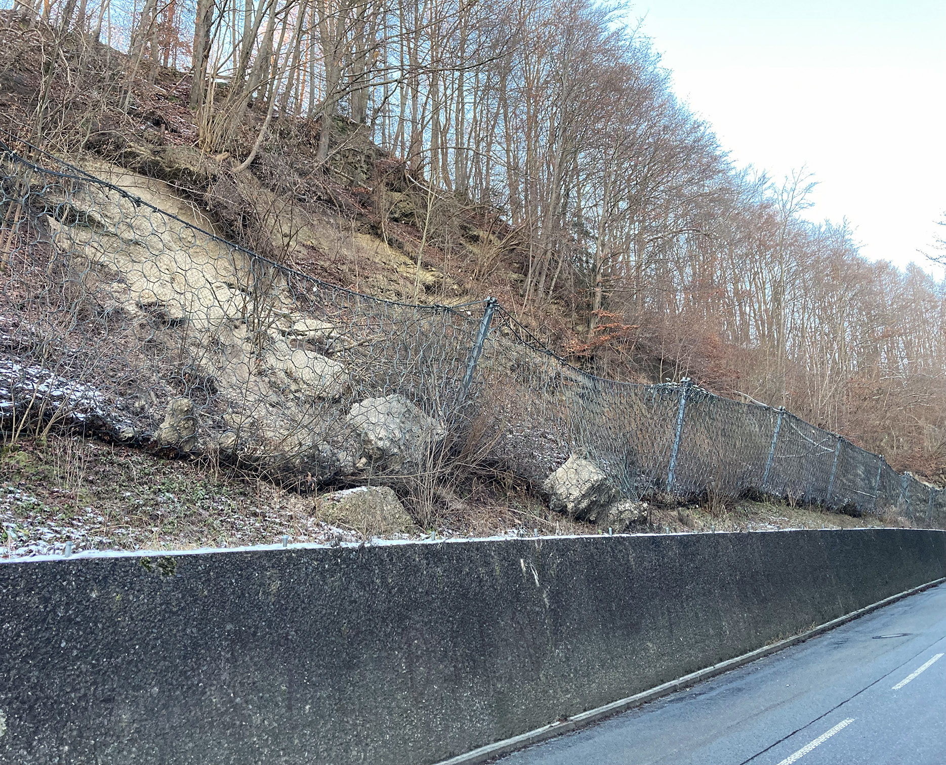 Dass das Anbringen von Steinschlagschutzzäunen ein unerlässliches Instrument zum Schutz vor Felsstürzen ist, kann man sehr eindrucksvoll an der St 2073 im Bereich des Mühlthaler Bergs im Landkreis Miesbach sehen. Gleich zweimal ist es hier zu einem Felssturz gekommen; zuletzt am 1. Weihnachtsfeiertag. Rund 20 Kubikmeter Geröll und Steinbrocken sind dort abgerutscht; dank des dortigen Steinschlagschutzzauns kamen sie oberhalb der Staatsstraße zum Stehen. Grund für den Felssturz war womöglich der sehr rasche Wechsel von Frost und Tauwetter in diesem Winter.