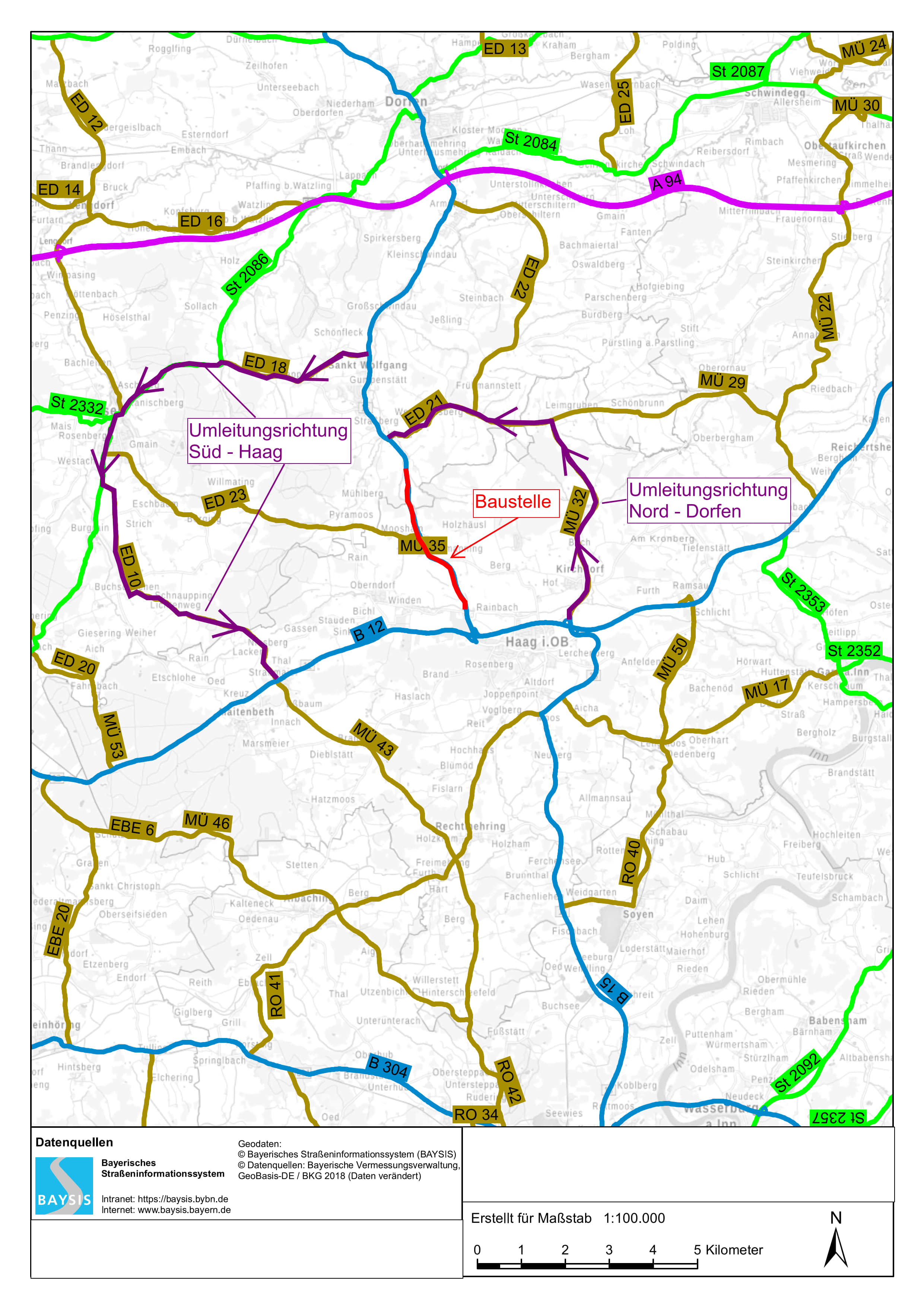 Da die Arbeiten aus Gründen des Arbeitsschutzes nicht unter halbseitiger Sperrung durchgeführt werden können, wird die Bundesstraße während der Maßnahme voll gesperrt. Die Umleitung erfolgt in Richtung Norden über die B 12 ,die MÜ 32, die MÜ 29 und die ED 21. Die Umleitung in Richtung Süden erfolgt über die ED 18, die St 2086 (Isen), die ED 10, die MÜ 43 und die B 12. Läuft alles nach Plan, kann die Sanierung am Freitag, 25. April abgeschlossen und die Vollsperrung der Bundesstraße wieder aufgehoben werden.