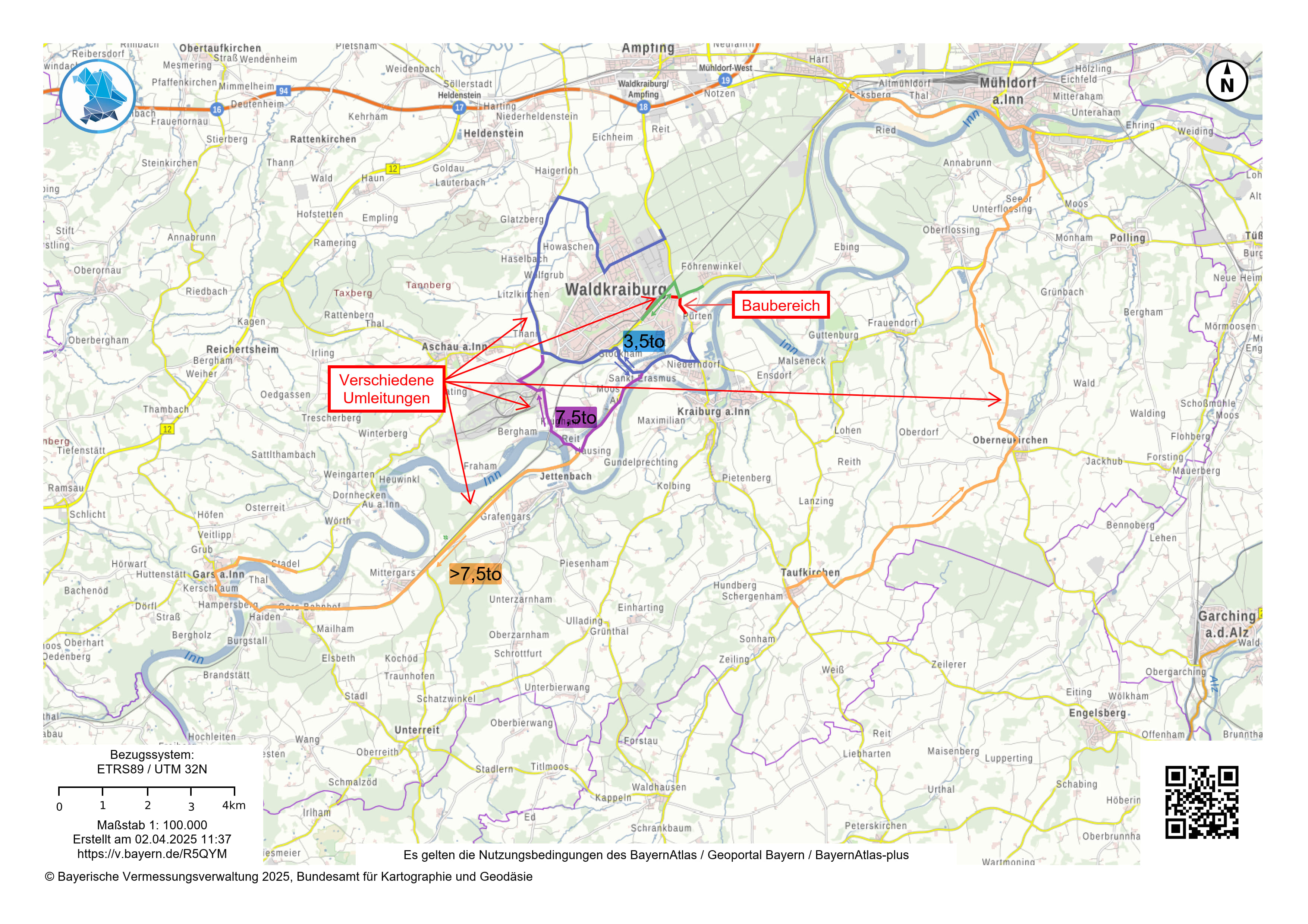 Der Übersichtsplan im Anhang dieser Pressemitteilung zeigt den Baubereich. Auf dem Umleitungsplan sind die verschiedenen Verkehrsführungen für Autos und Lastwagen eingezeichnet. Zusammen mit dem Pressefoto stehen Ihnen diese Pläne zur Veröffentlichung zur Verfügung, Quelle "Staatliches Bauamt Rosenheim".