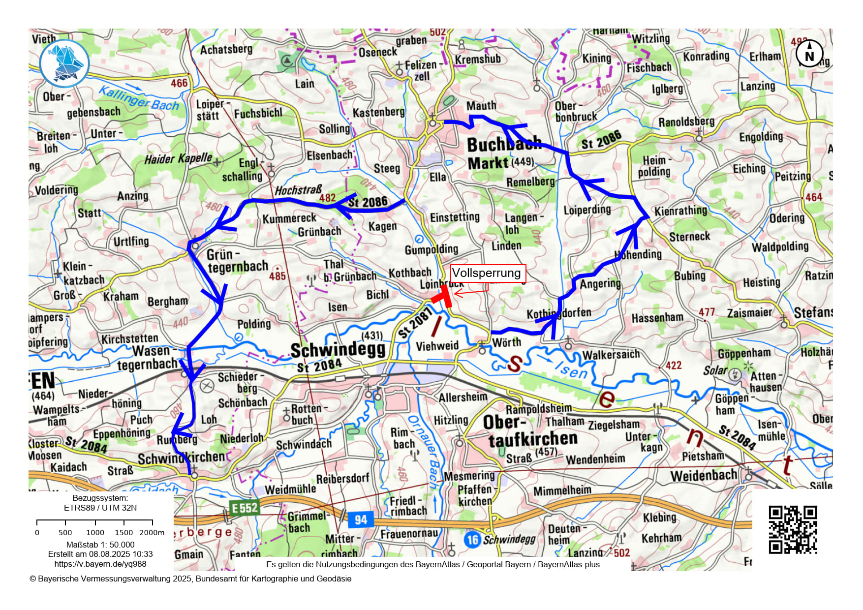 Während der Arbeiten muss der Knotenpunkt für den Verkehr gesperrt werden. Die Umleitung erfolgt in nördlicher Richtung ab Wörth über die MÜ 24, über Angering und Hohending, sowie die MÜ 25 und die St 2086 bis Buchbach. In südlicher Richtung erfolgt die Umleitung ab Kagen über die St 2086 bis Grüntegernbach und dann weiter auf der ED 25 bis Schwindkirchen.